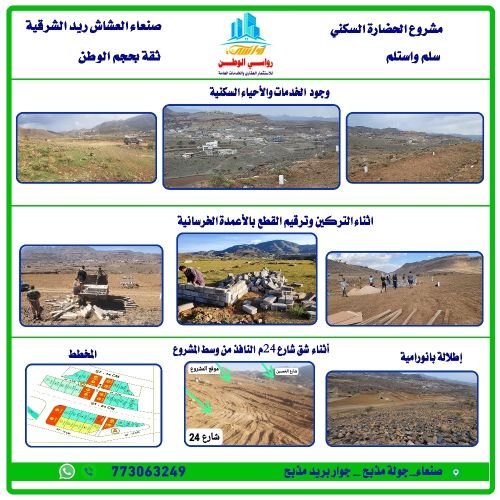 هل ترغب بإمتلاك قطعة أرض في العاصمة صنعاء؟؟ لكل من يحلم بمتلاك قطعة أرض تجارية أو سكنية في العاصمه صنعاء يؤمن بها مستقبله وأسرته ويبني بها بيت أحلامه يوجد لدينا قطع أراضي سكنية وتجارية للبيع بالكاش و التقسيط في العاصمة صنعاء ✅الموقع منطقة ريد العشاش ✅مميزات موقع المشروع موقع استراتيجي مطل على المنطقة بإطلالة جمالية خلابة وممتعة ومتميزة وأجواء نقية، تشعرك بالأستقرار والهدوء النفسي المريح لك ولأسرتك يوجد في المنطقة منتزهات وشاليهات راقية موقع المشروع في منطقة ريد الشرقية لشارع الخمسين خط العشاش منطقة مخطط تخطيط دولة بوحدات جوار معمدة لأكثر من اثنى عشر وحدة جوار في المنطقة ✅شوارعها تم شقها وفتحها من قبل الأشغال العامة والطرق مداخل رئيسية متفرعة من شارع الخمسين ومن خط صنعاء الحديدة