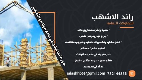 ابو شوقي .للمقاولات والخدمات العامة نبدأ حيث ينتهي الآخرون!مرحباً بكم في عالم الإنجاز والدقة، حيث الخبرة تُبنى، والجودة لا تُفاوض.مع طاقم مميز وخبرات طويلة في عالم المقاولات، نقدم لكم خدماتنا بثقة وأمانة... لأننا نؤمن أن العمل الجيد يتحدث عن نفسه، ونحن نحرص أن يكون صوتنا عالياً في كل مشروع ننفذه! أعمالنا تتحدث، ورضاكم هدفنا.> "الأساسات القوية لا تبني بيتاً فقط... بل تبني ثقة تدوم." تواصل معنا ودعنا نجعل من مشروعك قصة نجاح جديدة تُضاف إلى سجل إنجازاتنا.ت.967782144856+ت.967778227752+
