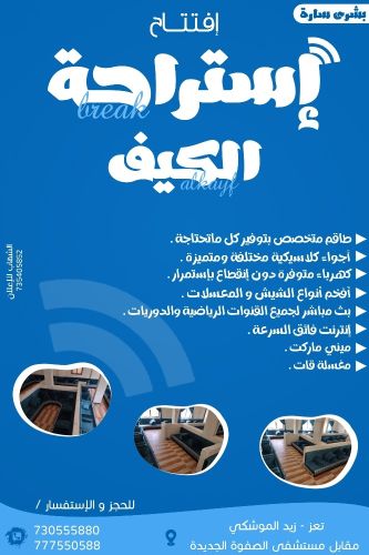 ● طاقم الخدمه سيوفر لك كل ماتحتاجه لراحتك ● اجواء المكان كلاسيكية مختلفه ومتميزه ● كهرباء متوفره دون انقطاع وبإستمرار ● أفخر أنواع الشيش والمعسلات ● بث مباشر لجميع القنوات الرياضيه والدوريات ● إنترنت فائق السرعه ( ذهبي ) ● ميني ماركت ( بقالة ) ● مغسلة للقات أنت في ضيافتنا.. #
