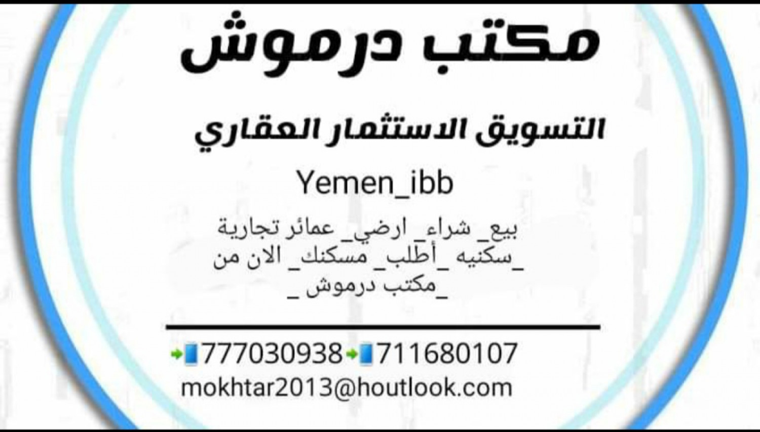 من افضل العروض واروع الفرص العقارية ليصلكم كل جديد في مدينة إب عماره استثمارية تجارية للبيع عمارة7ادوار استثمارية للبيع المساحة اربع قصب الا ربع حر عددالشقق 12 شقه واربع فتحات وبدروم دخلها بشهر مليون ريال شارع 24متر زفلت الموقع الظهار شارع الملكة أروى السعر350مليون نستقبل طلباتكم العقارية عروضنا كثيرة لا تنتهي