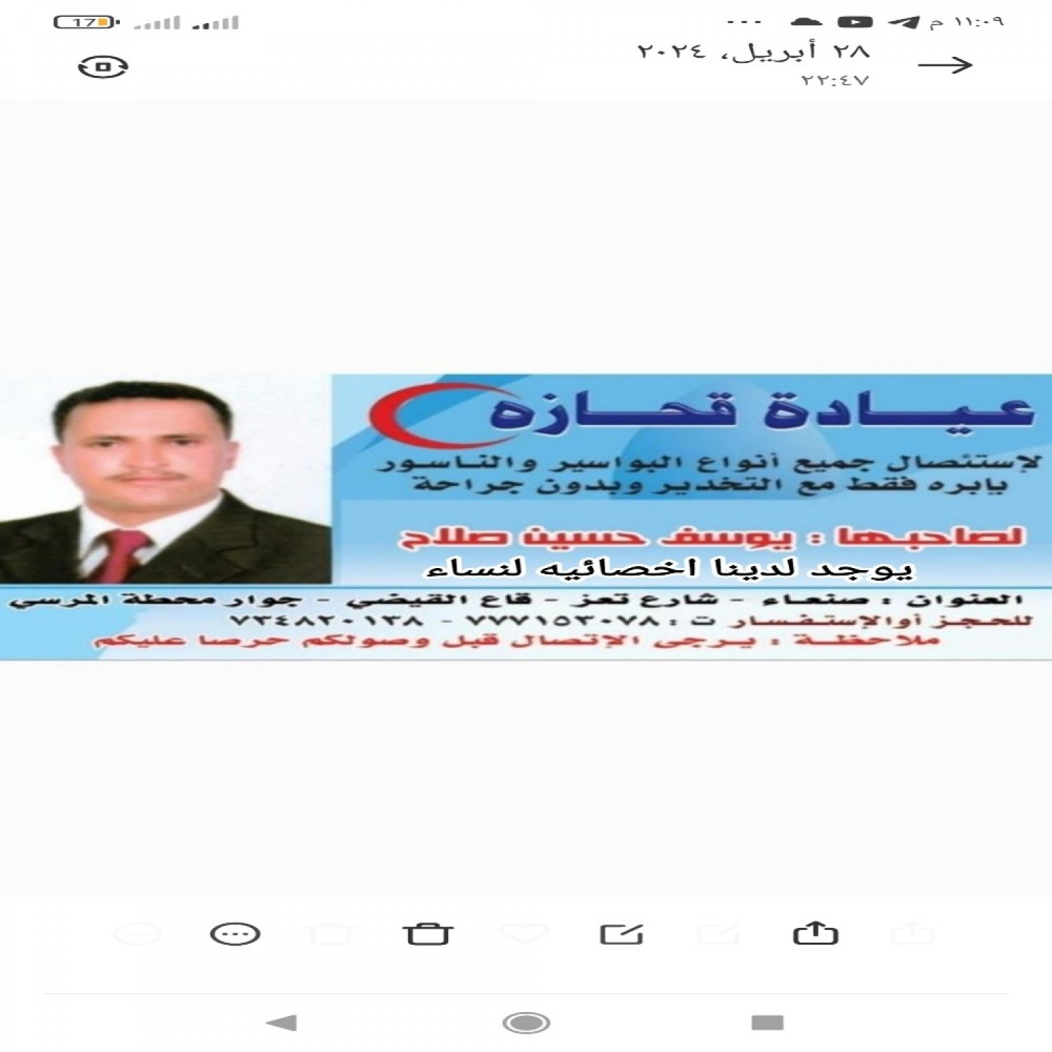 يوسف حسين صلاح دكتور في عيادة قحازه للبواسير عنوان العيادة قاع القيضي بعد سوق القات جوار محطه باب صنعاء د يوسف صلاح للحجز والاستفسار 777153078